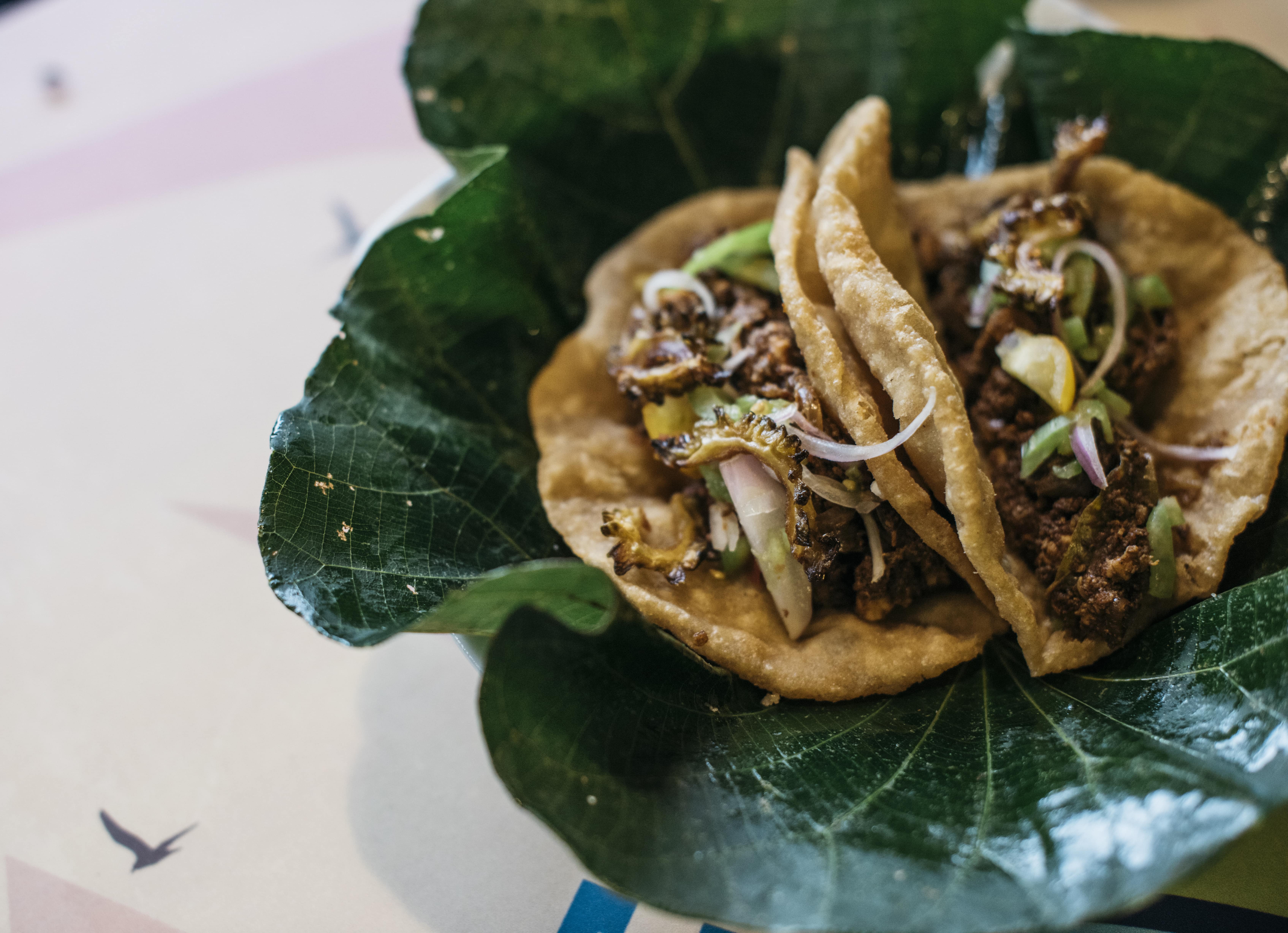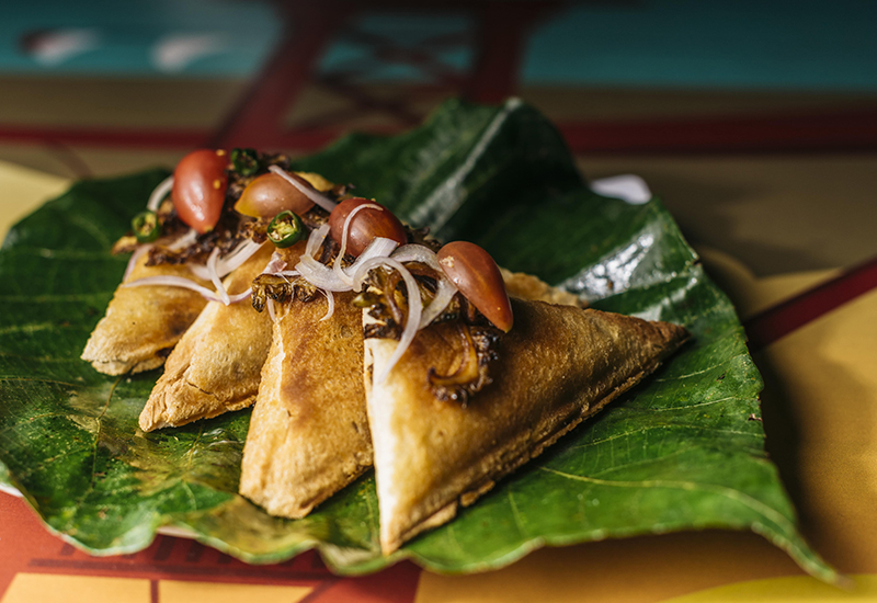 Poori Tacos – Pulled beef or chicken curry on soft-shell Pooris with karawila sambol. (Available in chicken & soya)