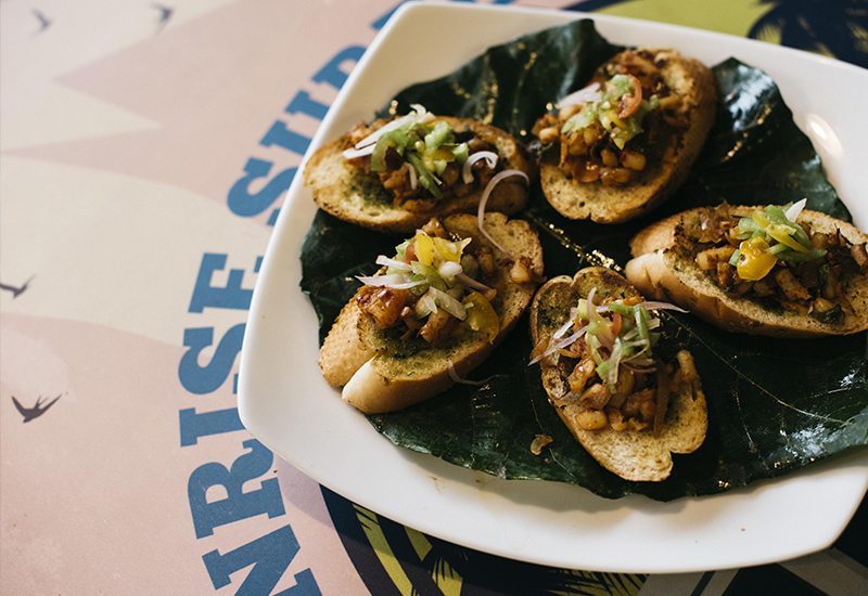 Spicy Cuttlefish Crostini – Jaffna-style devilled cuttlefish with karapincha butter and onion sambal.