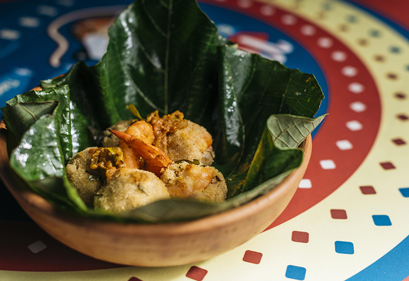 Uppuma Balls with Prawn – Diced prawn stuffed in Uppuma balls served with a fresh pathola salad and prawn curry gravy on the side.