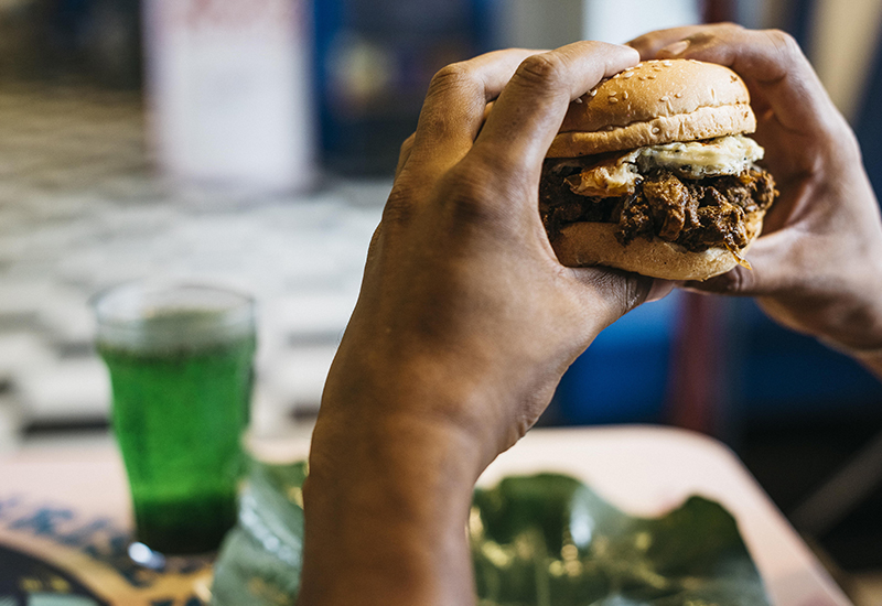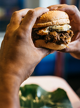 Jaffna Curry Burger – Authentic Jaffna Chicken Curry served in a soft bun topped with a Jaffna-style omelet fried in gingelly oil.