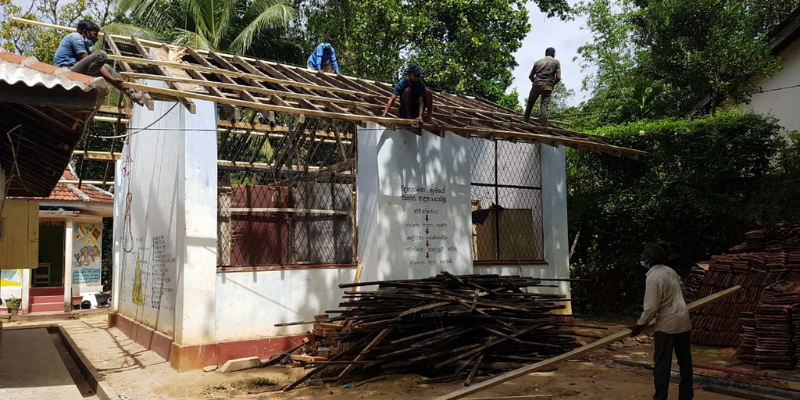 After partnering up with many donors, we started renovating the roofs in the school as the third phase. The most crucial building was the main building as its condition was worse and it was accommodating students from grades 5 to 9. Hence, we started the renovation with the school main building roof and then we renovated grade 1, 2 and 10 classroom roofs as well. With support from villagers, we completely replaced the roofing wood structure and asbestos sheets of all these three buildings within one month.