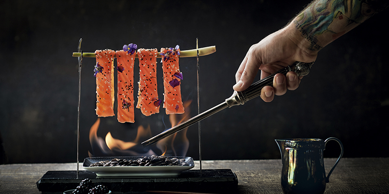- Salmon sashimi: with flamed-off coffee beans and blackberry soy sauce