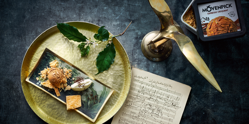 - Small puff-pastry slice ‘opéra’ style: puff pastry, Mövenpick Ice Cream Espresso Croquant and espresso.