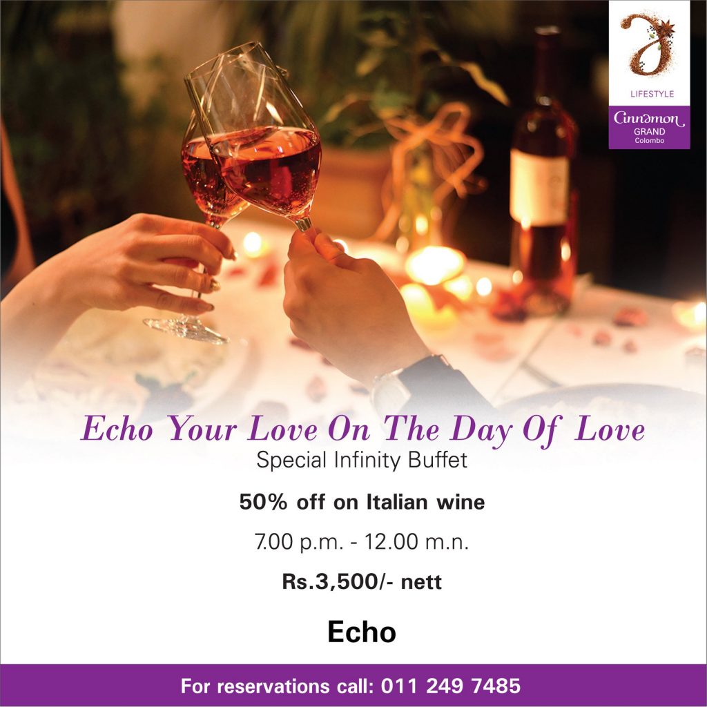 Echo your love and say “ti amo” as you celebrate your love with the special Infinity Italian Buffet at Echo, priced at LKR 3500/= net per person, and 50% savings on Italian wine, from 7PM to midnight.