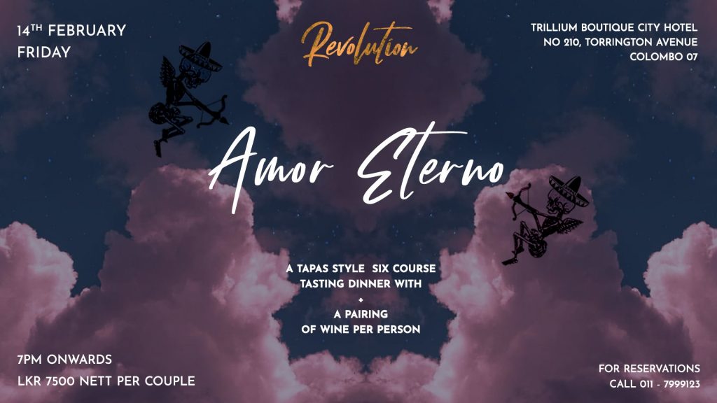 Experience the intimacy of a Mexican valentine as Revolution Colombo offers you the warmth of a candlelit dinner, whilst you take in the delectable cuisine and sip on the precisely chosen wine blended with the sensual charm of Latin soul music. Enjoy four separate menus including specifically curated dishes to a six course tapas style tasting dinner and a pairing of wine served per person. Get all this at just LKR 7500 nett per couple. Make sure to call 0117 999 123 for reservations.