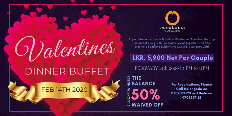 Commemorate romance at this resplendent destination that is the Mount Lavinia Hotel, built as an ode to love, this Valentine’s with a scrumptious buffet with your loved one. With a price tag of LKR 4200 per person, this buffet is from 7PM onwards. Exclusive offers for Commercial, HNB, Seylan and NTB card holders (Terms and Conditions apply).