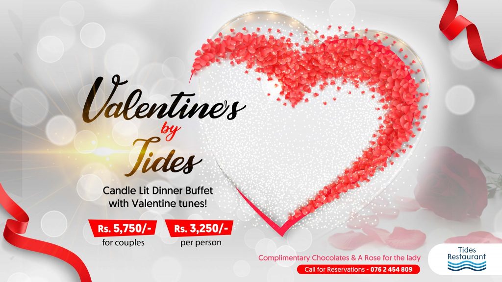 Celebrate true love this Valentines with Tides at their candle lit dinner buffet that comes with complimentary chocolates and rose for ladies. 7PM onwards this is priced at LKR 3250 nett per person and LKR 5750 nett per couple.