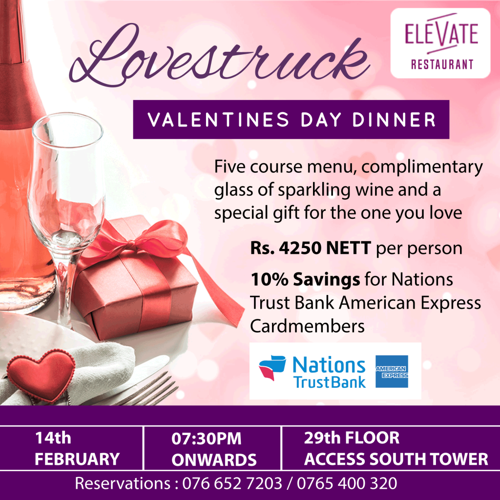 Enjoy a five-course dinner at the Elevate restaurant with your other half with a complimentary glass of sparkling wine and a special gift for your loved one to take home. All this for LKR 4250 nett per person, from 7.30PM onwards.