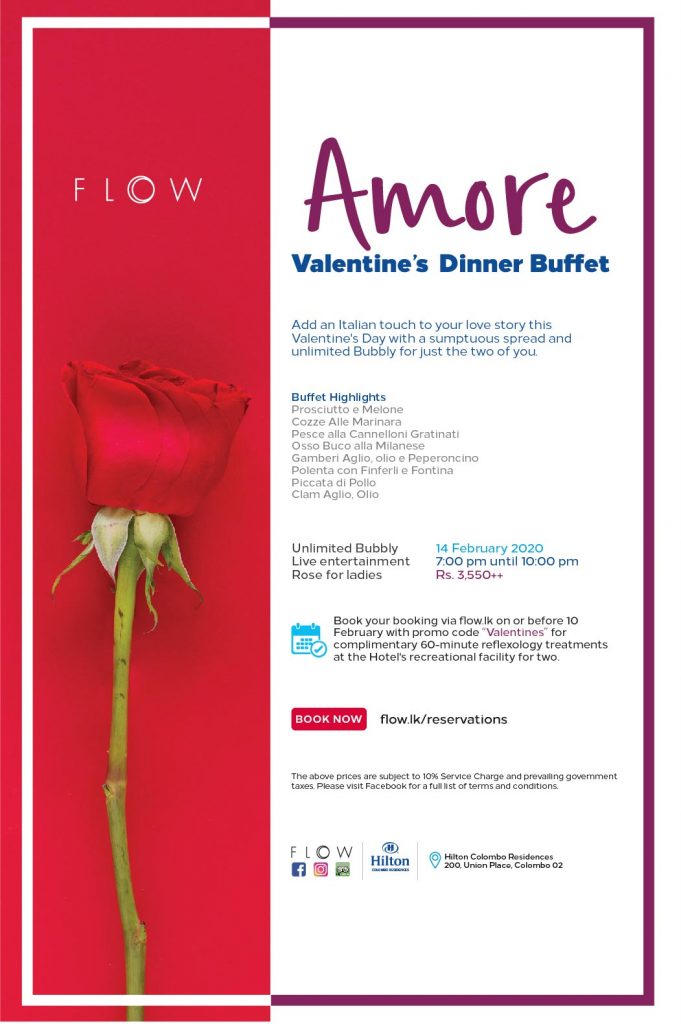If you’re craving for the food of love – Italian cuisine – then the FLOW at the Hilton Residences is the place to be. They’re offering a special valentine dinner buffet with unlimited bubbly and live music to keep you entertained, for just LKR 3550 nett per person.