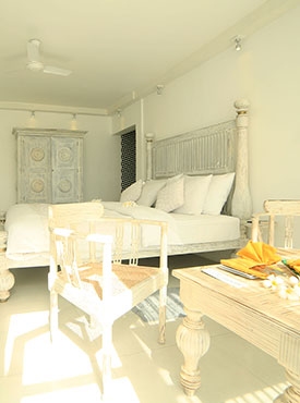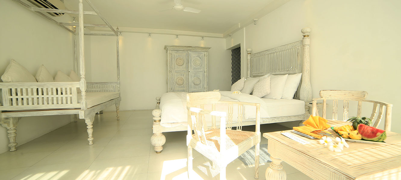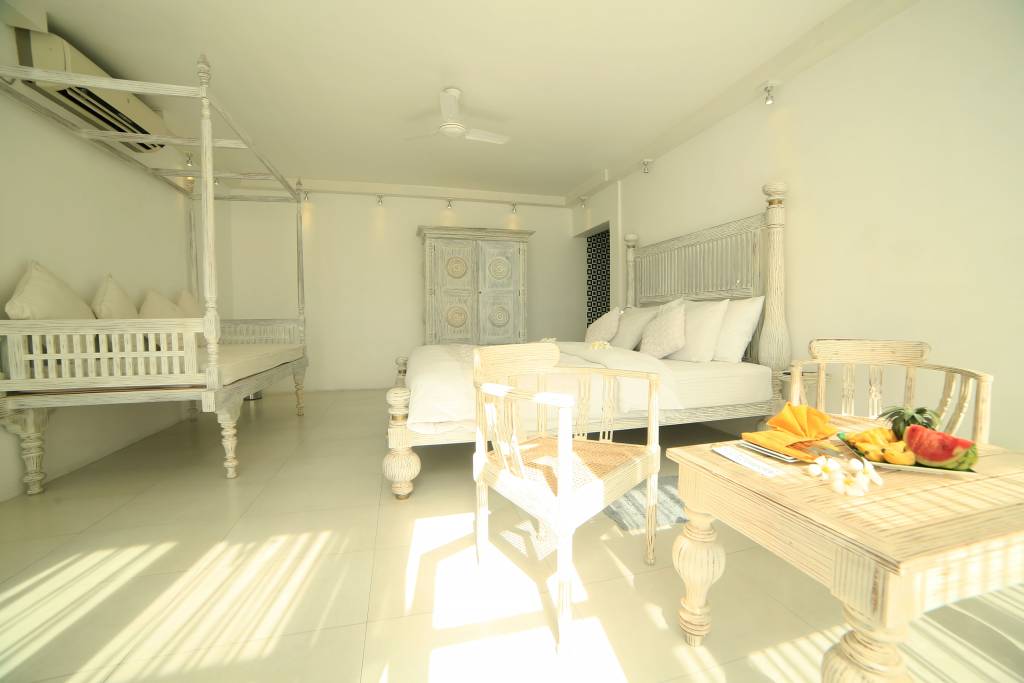 This family room consists of the most beautiful furniture and interior décor. Washed in white, this room consists of a massive bed, love seat, table, chairs and a matching wardrobe. This was the biggest room out of the 4, considering that this also acts as a family room for the bigger crowd.