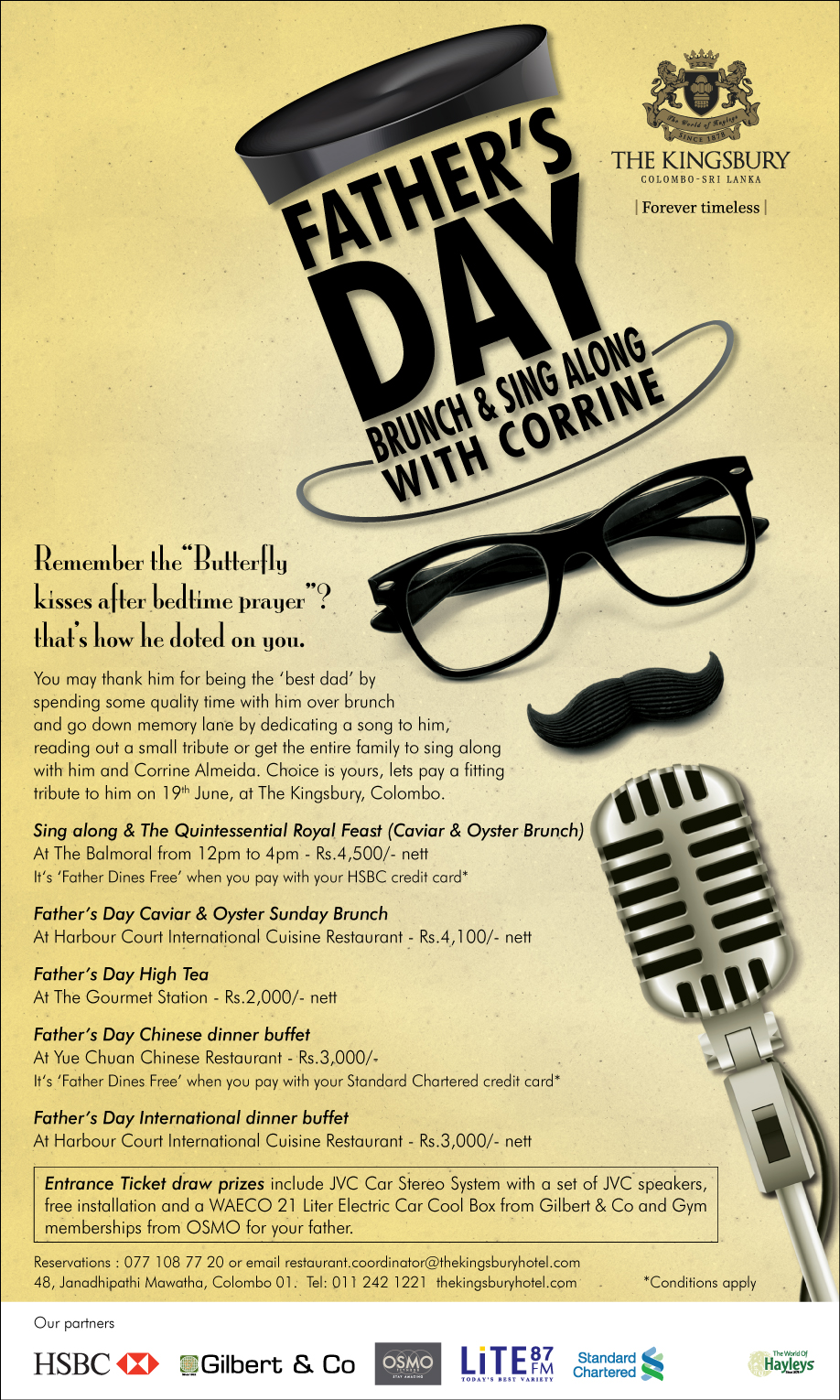 Men and food are equivalents in any equation. Give a man good food and you’ve found the way to his heart. There’s nothing more your old man is going to love than some good feast sunday brunch or some hearty dinner. So many hotels in Colombo have an amazing line-up of Father’s day brunch and High Tea. Since it’s Sunday, it’s an added advantage that most hotels in Colombo have their massive Sunday Brunch, whether it be Caviar and Oyster or Sri Lankan delicacies. The Kingsbury hotel has recently been advertising their father’s day lineup. You’ve got to check it out, there’s even a sing-along happening with Corrine! Your dad would love spending time with you, with good food and great company. Call up a couple of hotels before making reservations. Ask them if they have promos for Father’s day, if they don’t look into some that do. But if your dad already loves Sunday Brunch at a certain hotel, skip the research part, make a reservation and take him there.