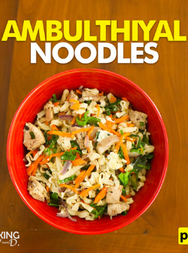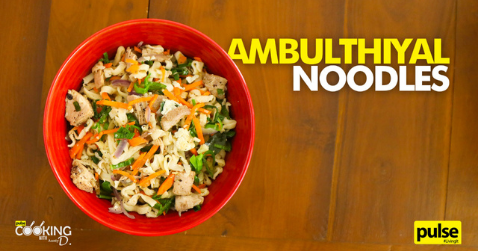 Next, add oil into a pan followed by curry leaves, rampe, ginger, garlic, bombay onion, an egg, ambulthiyal, green chillis, pepper, salt, carrot, leeks and finally add in the boiled Maggi noodles and mix well.