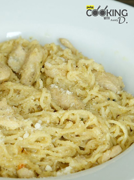 - Add cooked chicken and garnish with cheese.