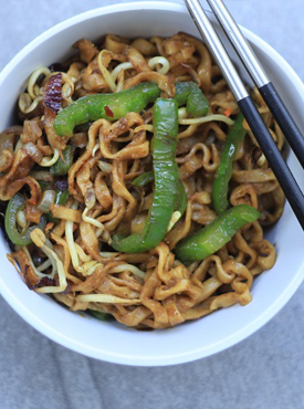 - Add oil to a pan and let it heat. Add onion and bell pepper and stir for a few minutes.