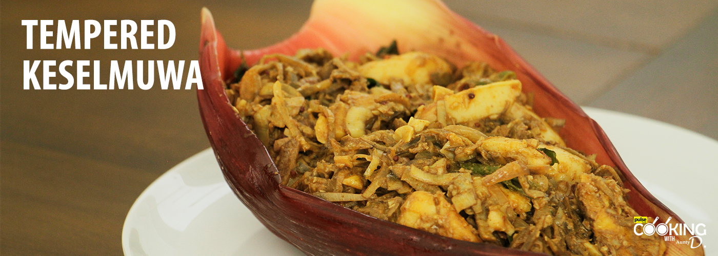 5. Add oil to this and when heated, add onion, curry leaves, and mustard seeds. When the seeds begin to pop, add the cooked keselmuwa curry. Mix well and take this off the flame.