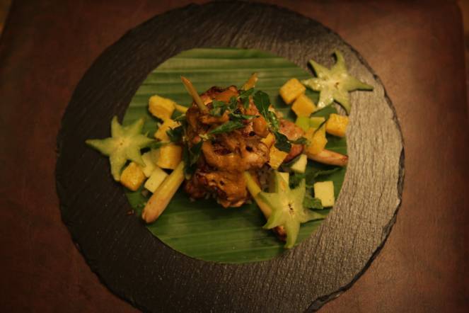 This dish consists of delicious chicken skewered with lemongrass, topped off with Peanut sauce, laid on top of Aged Basmati on a Banana Leaf, with a side of citrus salad! I found the salad very amusing since it had everything citrus-y like oranges, green apples, Star fruit, etc. not to forget the fact that the chicken was incredibly delectable and filling!