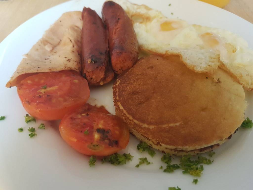 This was a massive serving of grilled tomatoes, eggs, bacon, and a choice between bread or pancakes, and chicken or pork sausages. When we opted for the chicken sausages and no bacon, the staff at Hebrews were nice enough to serve us chicken ham instead. A* attention to detail!