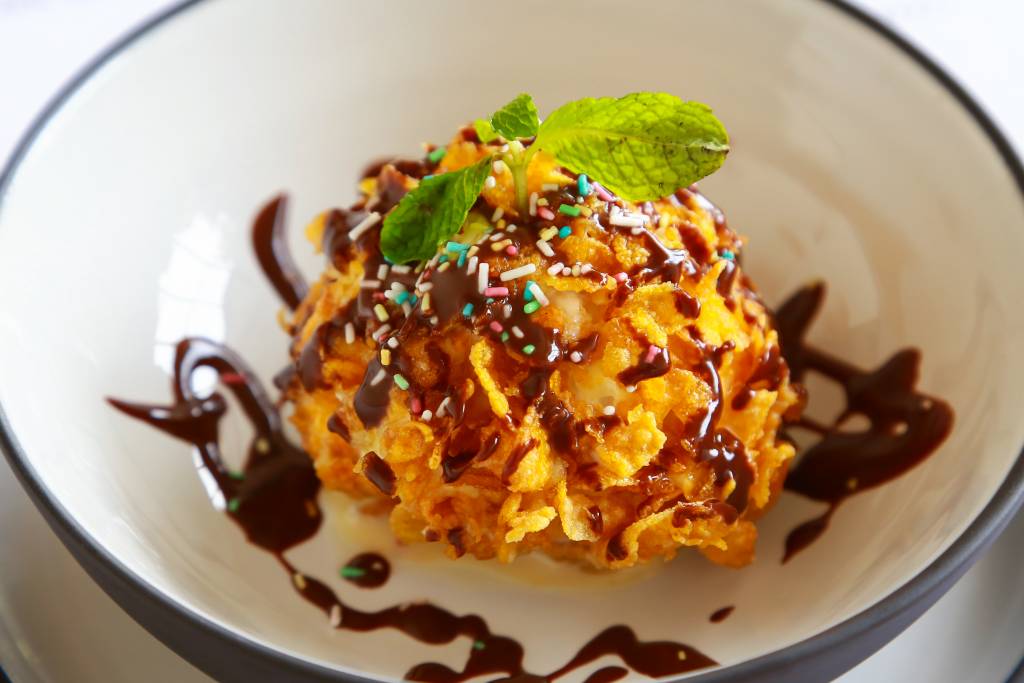 The Deep fried ice cream comes coated in cornflakes, and topped with sprinkles and chocolate sauce. It’s quite a treat for your sweet tooth and the meeting point between hot and cold creates a pleasantly weird experience for your taste buds. Make sure you get this one to share though ‘cause it’s pretty darn sweet and after the hefty mains, it would be quite difficult to finish.