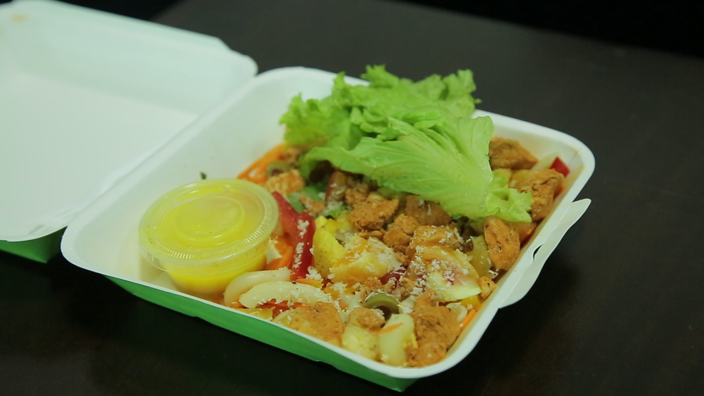 This week’s special was the Tropical Pineapple salad and for good reason too. It consisted of some ingredients which are totally normal and mainstream like bell peppers, carrots and herbs and a few interesting ingredients like oranges, pineapple and coconut! The textures and flavors worked incredibly well together – definitely screaming Hawaii right there in our office – but what really brought the tropics out of the combination was the dressing which was tangy, fruity and quite exotic. We chose to have the salad with chicken and pasta and boy, it worked well together!