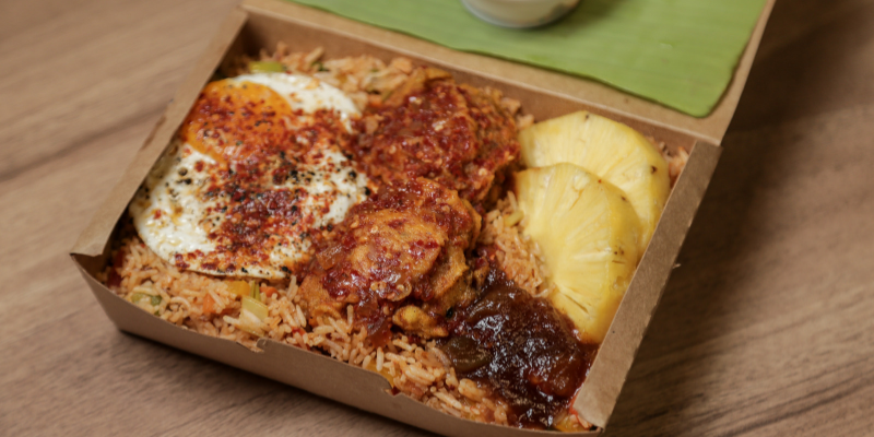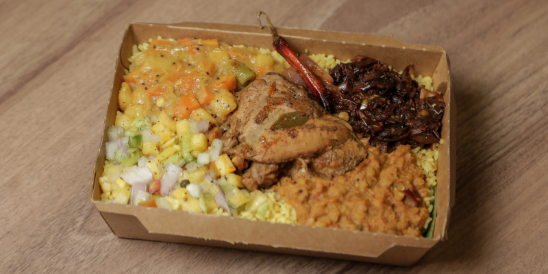 This colour-clad meal came with a great serving of your usual favourites: curried chicken, dhal, brinjal pahi, carrot with potato curry and pineapple salad – simple yet satisfying! These portions could comfortably accommodate two servings (as did the rest of the meals that we tried!), and the way this meal stood the delivery and transportation time while retaining its freshness, flavour and moisture is to be commended!