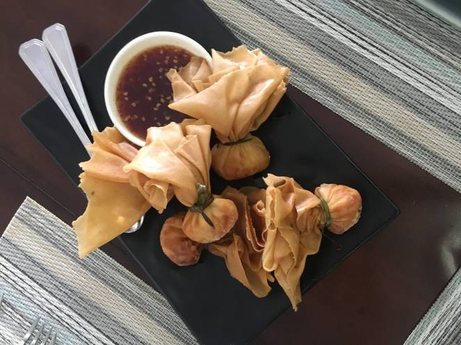 Our first appetizers were minced crispy chicken dumplings served with sweet chili sauce. These crispy dumplings, albeit extremely oily, were yum. This is your everyday dumpling dish sans soy sauce. What was not so ‘everyday’ about this dish was the filling inside the dumpling. It leaves you licking your fingers, wanting more. The chicken in the filling is soft, tender and the filling overall, full of flavor.