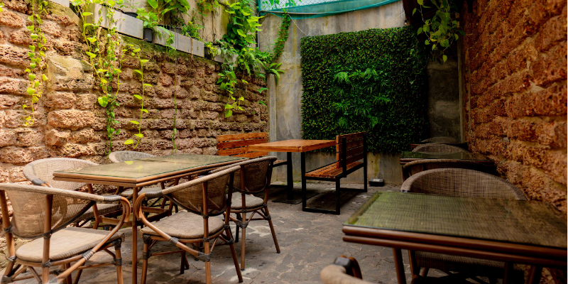 It maintains a green undertone throughout its architecture, which is accentuated by plants, creating an atmosphere of simple luxury. The exposed brick walls along with the cane lampshades add a layer of contrast, providing a homely interior, and tie in the colour theme of green and brown. The theme continues with the outdoor space being adorned with more plants and exposed brick, which is ideal in the night as fairy lights brighten up the space to create an intimate setting. Batik artistry adorns the walls, bringing a Sri Lankan feel to this experience.
