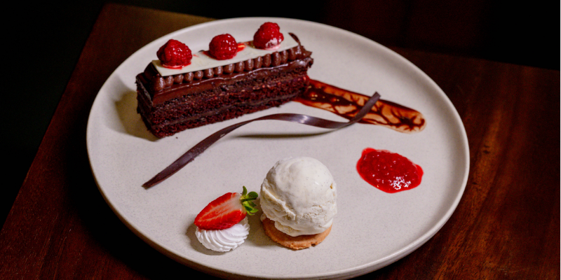 A deeply chocolatey, fudgy dessert layered with raspberry ganache and served with ice cream. While the chocolate flavour is strong and well-executed, it stops short of feeling truly indulgent. A thicker ganache layer, warmer element, or more textural contrast would have added decadence, but it remains a satisfying choice for chocolate lovers.