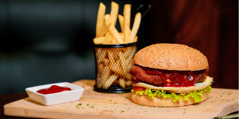 Stuffed chicken breast with chicken ham and melted cheese, topped with a fried egg and BBQ mayo. Rich, indulgent, and well-constructed. A true pub-style burger that delivers on flavour and comfort.