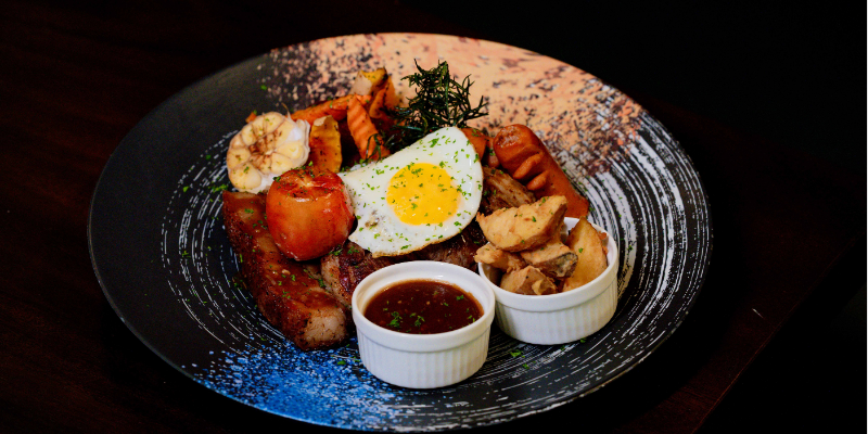 A large plate with chicken thighs, wings, pork, grilled beef, sausages, a fried egg, and garlic potato wedges. While the variety is appealing, several cuts of meat were noticeably tough.