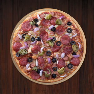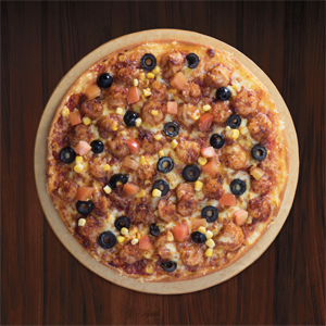 Pepperoni, chicken sausages and chicken bacon; these are the godly ingredients in the Super Supremo- their most loaded pizza yet. The Supremo is such a run for your money. It’s loaded and does not let you down. It’s a gourmet pizza with a thin, light crust baked with a delicious combination complemented by onions and olives together with slices of jalapeños, all blanketed by deliciously stringy mozzarella cheese.